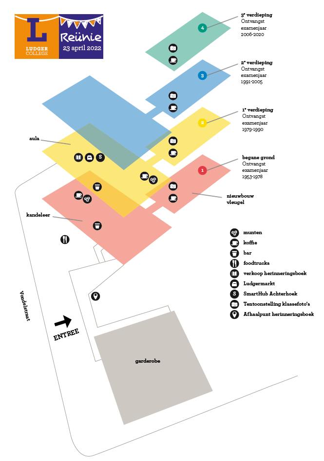 Om er voor te zorgen dat niemand lang in de rij hoeft te staan bij binnenkomst vindt het ontvangst plaats op basis van je examenjaar. Vanaf 12.00 uur is de eerste groep welkom (2006-2020) en is er een ontvangstruimte op de 3e verdieping. Om het halve uur is een volgende groep van harte welkom op een eigen etage. Hier zal het netwerken met jouw jaarlagen dan ook beginnen. In het tijdschema kan je zien op welk tijdstip wij klaarstaan om jou, samen met je klasgenoten te verwelkomen. Zorg je er voor dat je je ticket gereed hebt bij binnenkomst?