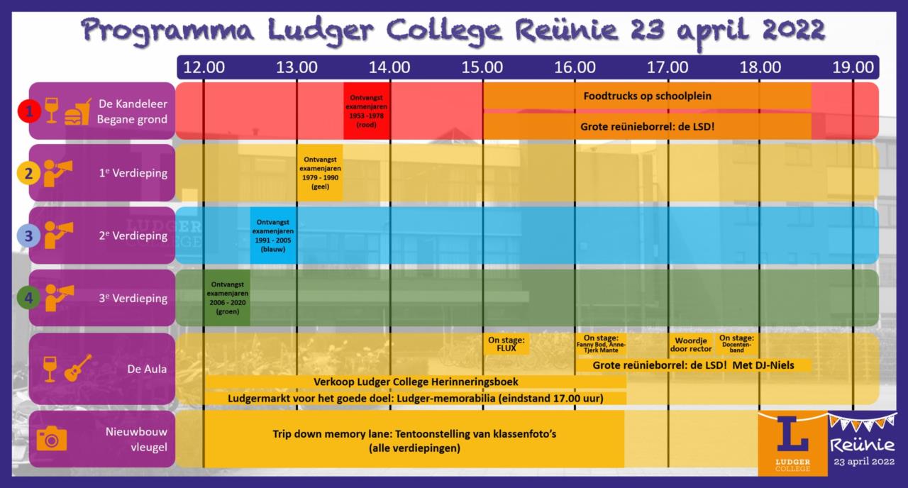 De plek waar je heel wat uren hebt doorgebracht, de aula, zal een centrale rol spelen in het programma. Op het podium waar vele edities van het Ludgertheater, de pauzeconcerten en diploma-uitreikingen hebben plaatsgevonden zal de hele middag muziek klinken. Schoolbands én de docentenband zullen de aula laten vullen met herkenbare klanken. DJ-Niels zal de borrel muzikaal omlijsten. Inderdaad; een borrel, want die mag niet ontbreken! Deze vindt gedurende de hele middag plaats in zowel de aula én de kandeleer! Ook kan je in de aula een bezoek brengen aan de Ludgermarkt waar mooie memorabilia te koop zijn. De opbrengst zal gaan naar het goede doel: een scholenproject in de Filipijnen, welke mede-gecoördineerd wordt door oud Ludger docent Henk Ankoné. Heb jij het herinneringsboek nog niet besteld? Koop deze dan alsnog in de aula!